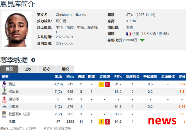 nkunku, 27, cao 1,77 mét và có đầu phát chân phải. Anh ấy có thể chơi như một tiền vệ, trung tâm và cầu thủ chạy cánh trái. Hợp đồng của anh với Chelsea được ước tính là 35 triệu euro vào năm 2029. Nkunku đã có 42 lần ra sân cho Chelsea trong các cuộc thi khác nhau mùa trước, bao gồm 22 lần bắt đầu, với tổng số 2039 phút, đóng góp 14 bàn thắng và 5 pha kiến tạo; Anh ấy đã có 5 lần ra sân trong World Cup 2025, bao gồm 3 lần bắt đầu, 1 bàn thắng và 0 pha kiến tạo, và tình trạng của anh ấy thật chậm chạp.