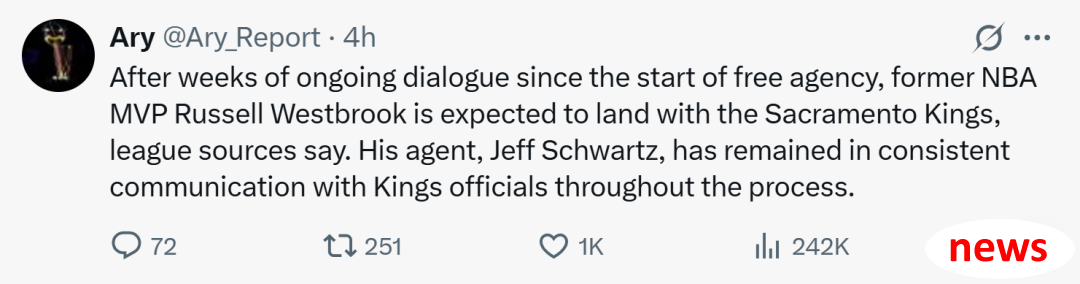 Hoặc chúng ta nên nói rằng kể từ khi thị trường tự do mở ra, nhà vua có nhiều tin đồn nhất với Westbrook. Trước đây, phóng viên TA Sam Amick đã báo cáo rằng nhà vua quan tâm đến Westbrook, và tổng giám đốc Scott Perry rất thích Westbrook.