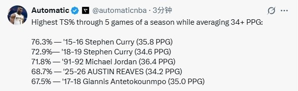 Theo thống kê từ phương tiện dữ liệu Tự động, trong bảng xếp hạng tỷ lệ sút thực sự của Reeves, người ghi trung bình hơn 34 điểm mỗi trận trong 5 trận liên tiếp, 68,7%, chỉ đứng sau Curry và Jordan.