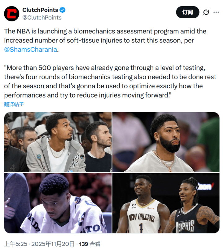 Vào ngày 20 tháng 11, mùa giải NBA thông thường tiếp tục diễn ra. Để đối phó với tần suất chấn thương ngày càng tăng của các ngôi sao NBA, truyền thông Mỹ đưa tin rằng một chương trình đánh giá cơ sinh học trên toàn giải đấu đang được triển khai và hơn 500 cầu thủ đã hoàn thành bài kiểm tra.
