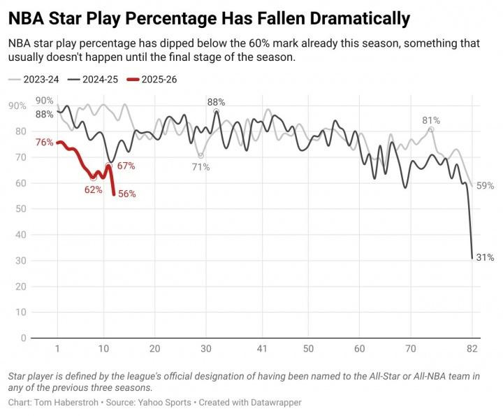 Theo thống kê, các ngôi sao NBA đã bỏ lỡ hơn 200 trận mùa này, gấp đôi so với cùng kỳ mùa giải 2023-24. Định nghĩa chính thức về ngôi sao trong chính sách tham gia của cầu thủ NBA là: một cầu thủ đã được chọn vào ít nhất các đội All-Star hoặc All-NBA trong ba mùa giải vừa qua. Mùa giải này, có tổng cộng 45 cầu thủ đáp ứng tiêu chí đó, nghĩa là trung bình một ngôi sao NBA đã bỏ lỡ khoảng 5 trận đấu. Ngoài ra, ngay cả khi loại trừ Tatum, Haliburton, Lillard và Irving, những người đã được xác nhận vắng mặt từ lâu, tỷ lệ ra sân của các cầu thủ ngôi sao trong tháng đầu tiên của mùa giải chỉ là 75%, thấp hơn rất nhiều so với mức 87% của hai năm trước.